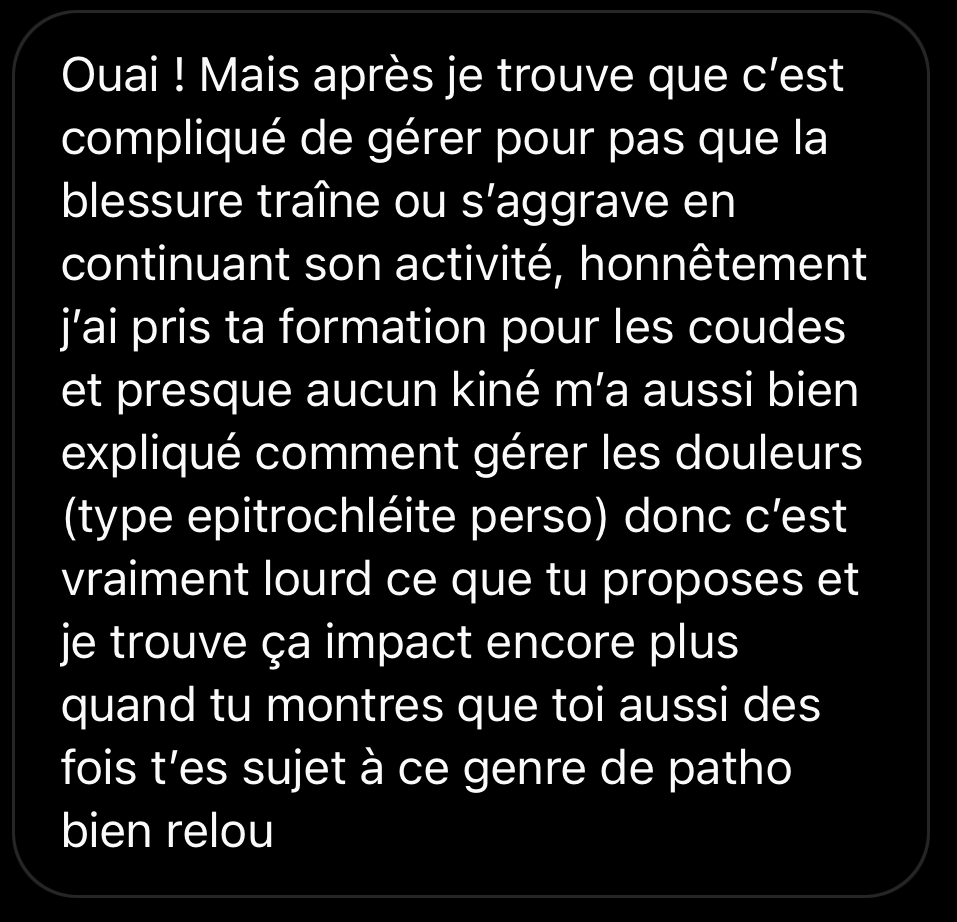 Et cette douleur au coude te prive de tant de choses importantes pour toi.