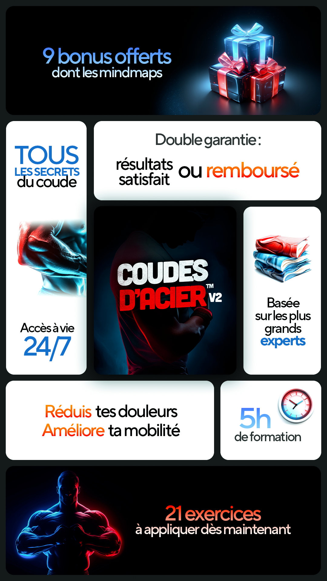 À travers des modules progressifs, je vais t’enseigner tout ce qu’il te faut pour comprendre, renforcer et libérer complètement tes coudes.