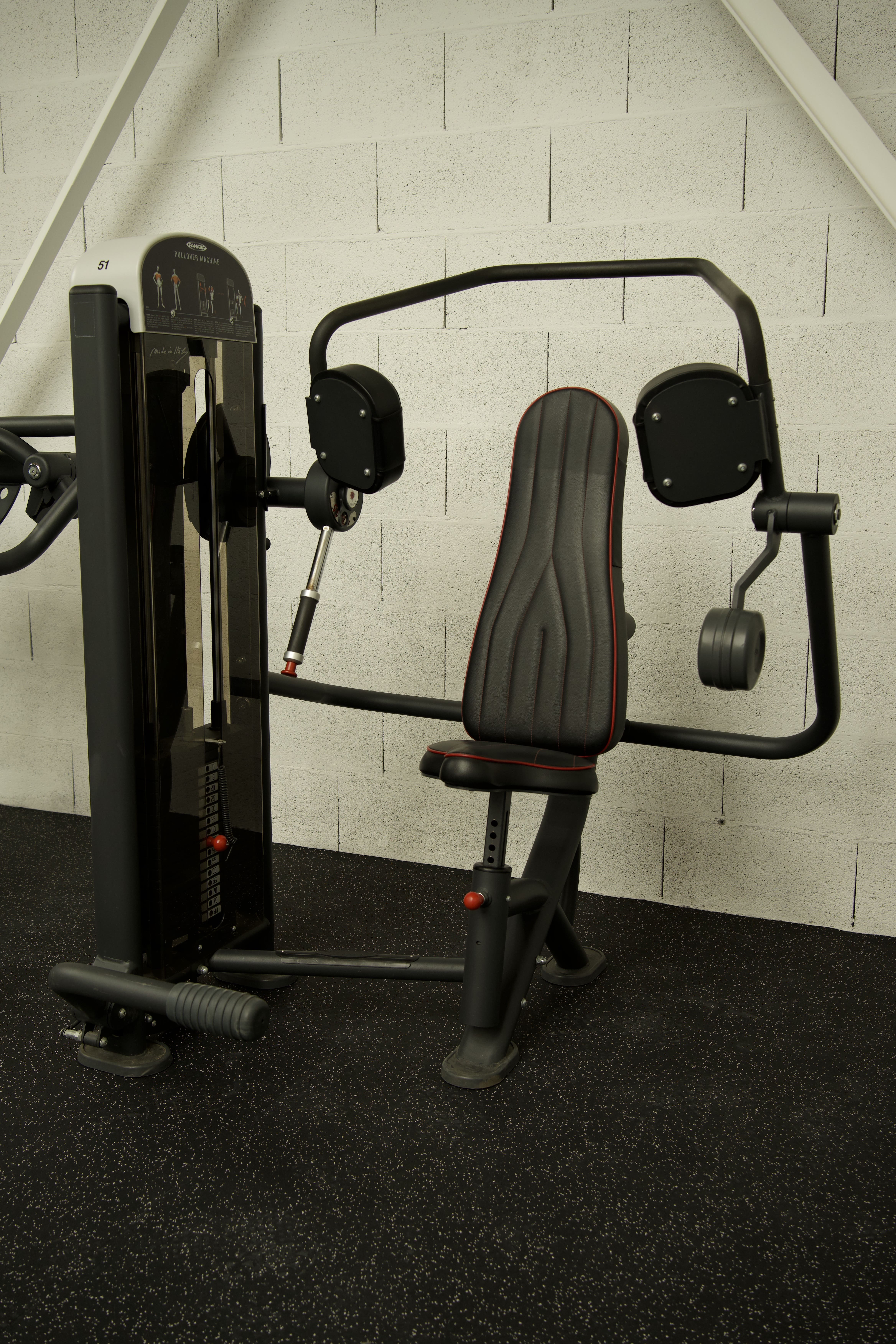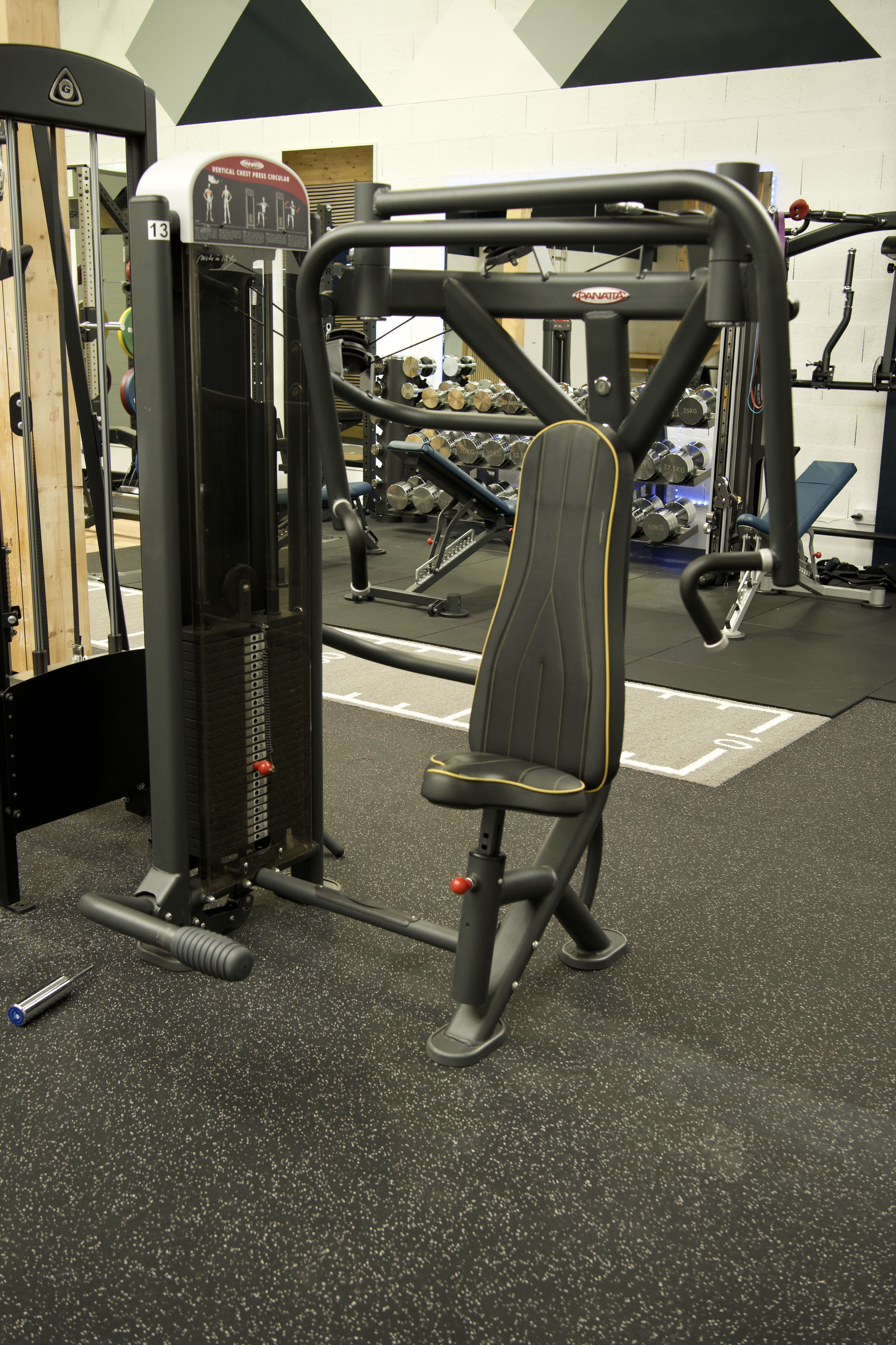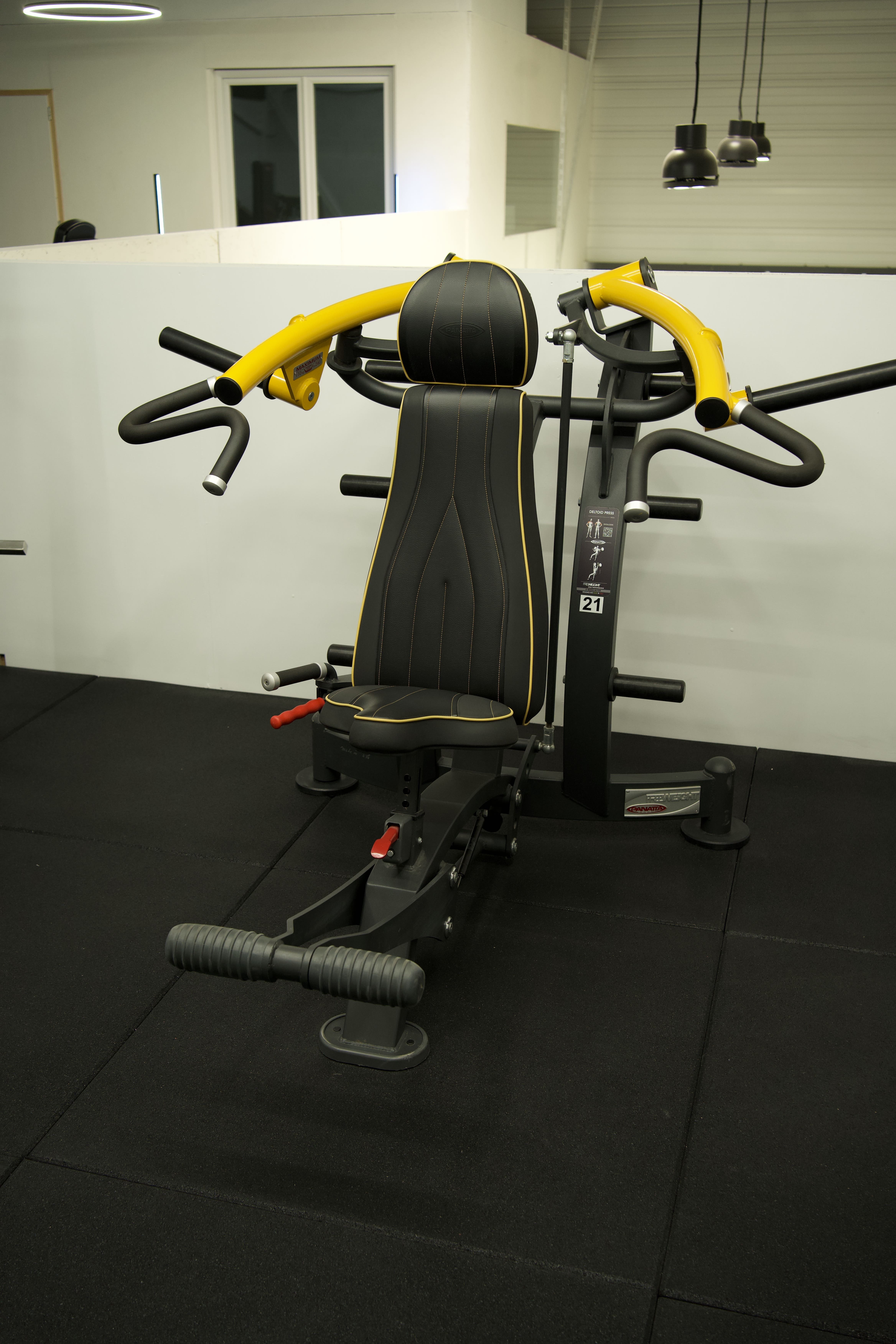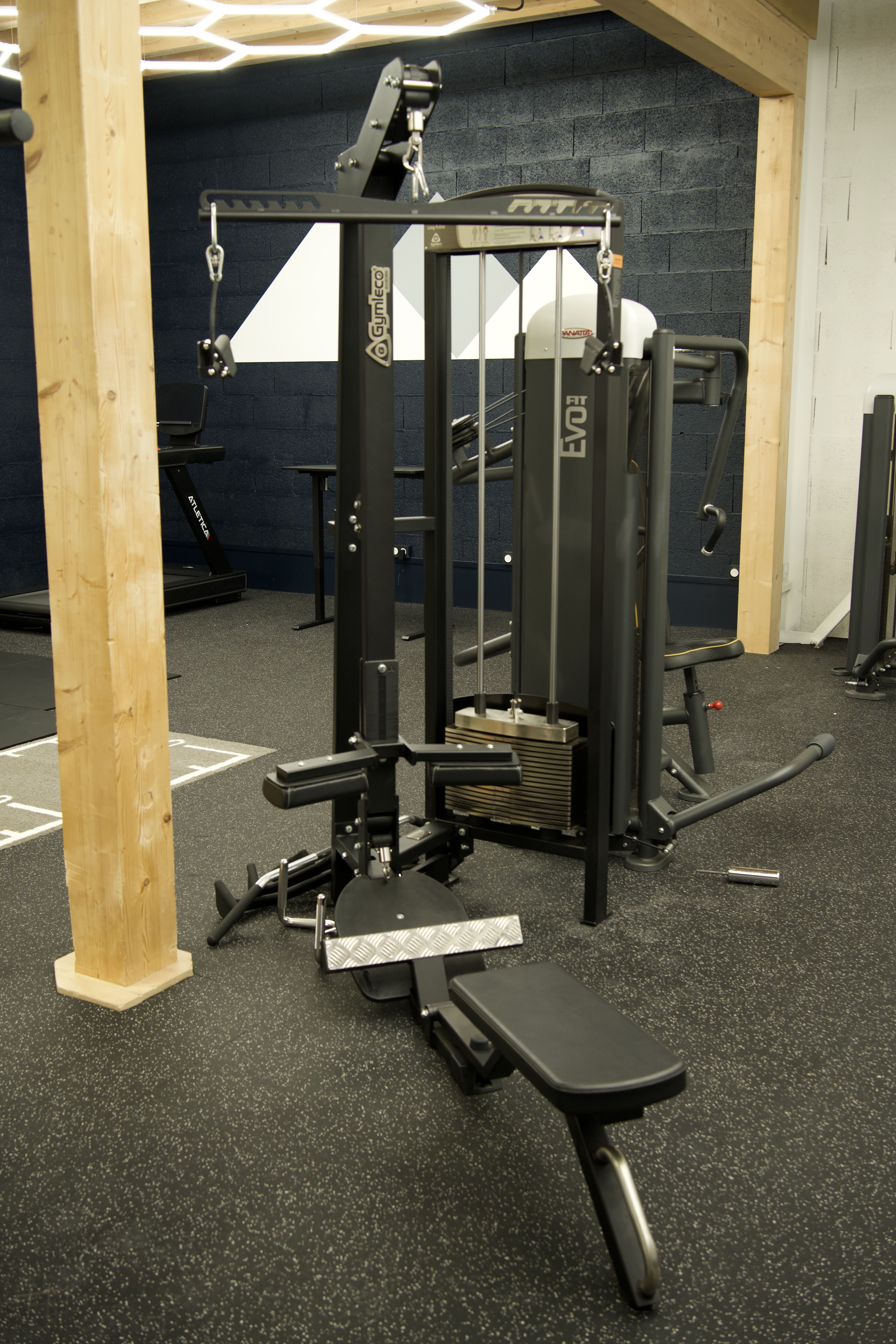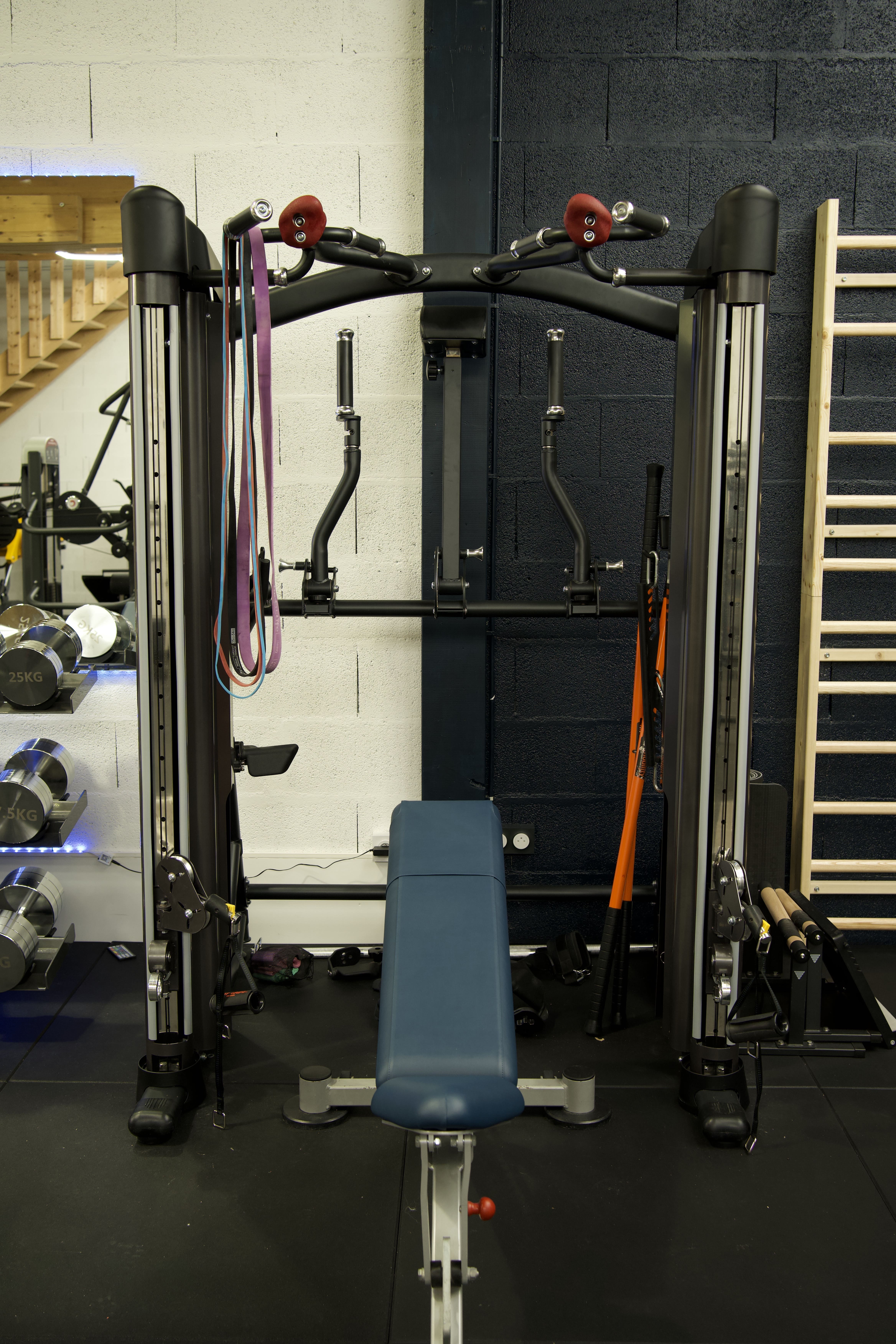 Double poulie réglable Taurus Fitness, banc Panatta, divers accessoires Prime Fitness USA, élastiques, bâtons de mobilité, barres parallèles et espalier