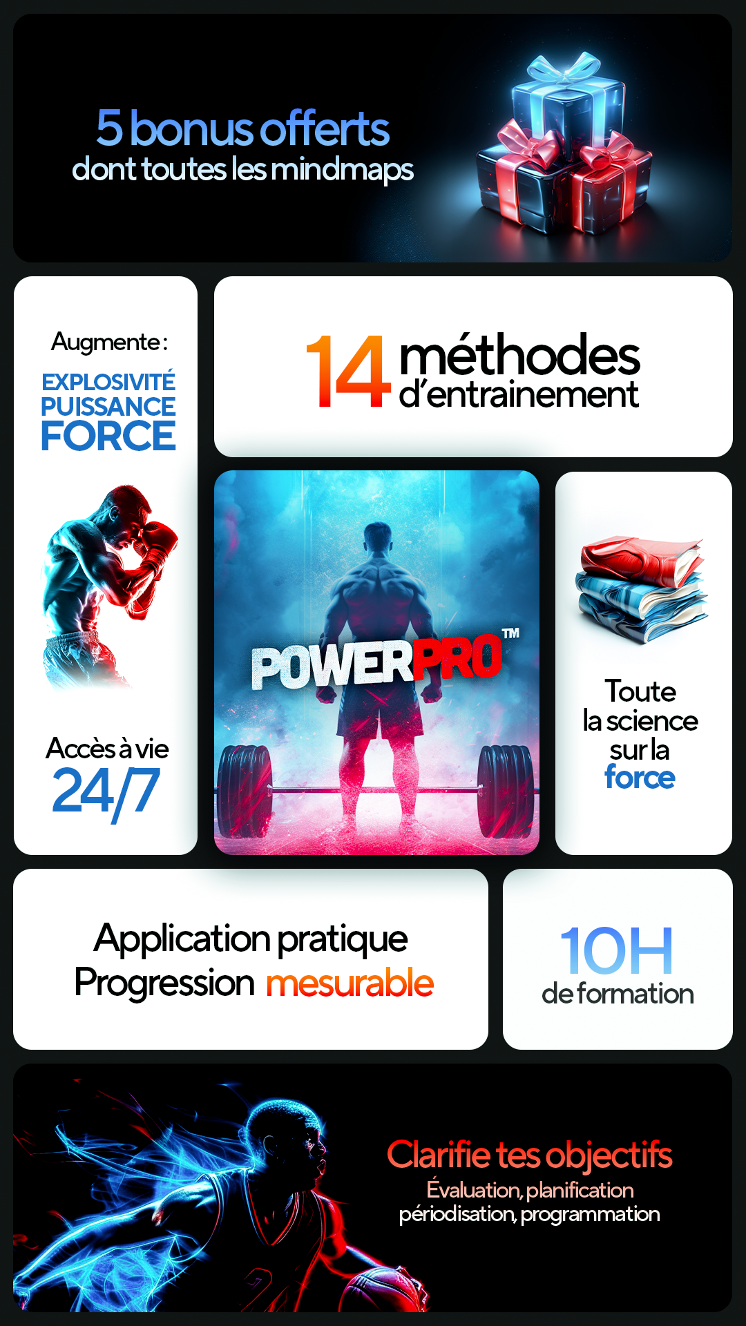 Je te révèle toute la science de la force, de l'explosivité et de la puissance et je t'apprends comment évaluer ces qualités, comment planifier, périodiser et programmer pour en gagner le plus possible dans n'importe quel contexte.